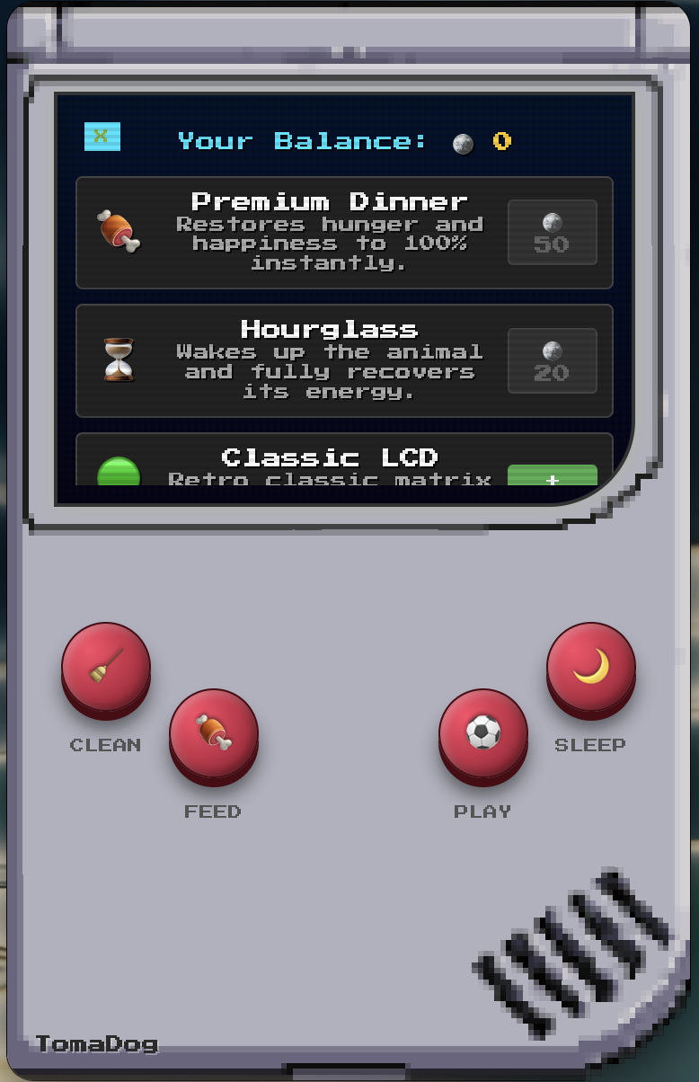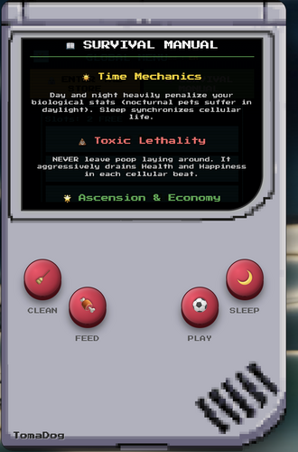 - Real-Time Tamagotchi Mechanics: Feed, play, and clean up after your pet. Be careful! Neglecting your pet has permanent consequences. If the environment gets too toxic from uncleaned messes, your pet will face a permanent Game Over.